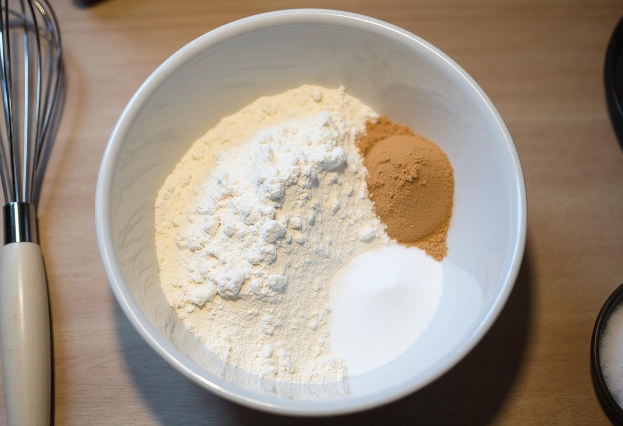- Vorbereiten der trockenen Zutaten: Mehl, Zucker, Backpulver und Salz in einer großen Schüssel vermengen.