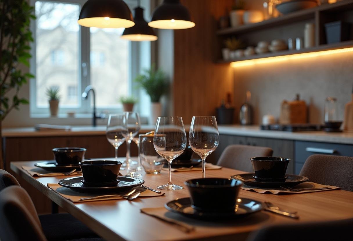 Der finale Schliff macht den Unterschied! Jetzt ist es an der Zeit, Gestaltungselemente hinzuzufügen, die Ihre Küche zu einem einzigartigen Ort machen. Ein eleganter Esstisch in der küche schwarz, kombiniert mit stilvollen Dekorationen, rundet den Look abrundend ab. Wählen Sie einen Esstisch, der zum Stil Ihrer Küche passt. Ein Holztisch sorgt für Wärme und Gemütlichkeit, während ein Glastisch einen modernen Touch verleiht. Passende Stühle sind ebenfalls wichtig für das Gesamtbild. Dekorieren Sie den Esstisch mit einer schönen Tischdecke, Servietten und Kerzen. Ein Blumenstrauß oder eine Obstschale bringen Farbe und Leben in den Raum. An den Wänden können Sie Bilder, Fotos oder Regale mit dekorativen Gegenständen anbringen. Achten Sie darauf, dass die Dekoration nicht überladen wirkt und zum Stil der Küche passt. Schwarzes Geschirr und Besteck passen perfekt zu einer küche schwarz und unterstreichen den eleganten Look. Ihre Küchenreise ist nun vollendet! Genießen Sie das Kochen und die schöne Atmosphäre. Und falls Sie noch eine leckere Soße für gefüllte Paprika suchen, schauen Sie mal hier: leckere Soße für gefüllte Paprika!